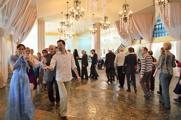 Получился настоящий бал! Начали с традиционного для русских балов танца — полонеза. Поначалу участники вечера немного смущались, даже перешептывались: «Ну, какие танцы в нашем состоянии?!». Но постепенно сомнения ушли прочь — заводная, но размеренная музыка вовлекла в движение практически всех!