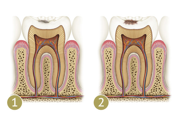 Начинается кариозный процесс с появления на поверхности эмали белого, коричневого или черного пятна, порой заметного только стоматологу (1). Именно поэтому важно посещать стоматолога 2 раза в год и выявлять и лечить кариес на его ранних стадиях. Кариес молочных зубов развивается гораздо быстрее, чем кариес постоянных зубов, так как детская эмаль менее плотная. По мере прогрессирования кариозного процесса (2) образуется дефект эмали в виде небольшой полости и появляется чувствительность зуба к сладкому. Под эмалью находится дентин — ткань, которая составляет основу зуба, содержит множество дентинных канальцев и коллагеновых волокон и уже не является такой плотной, как эмаль.