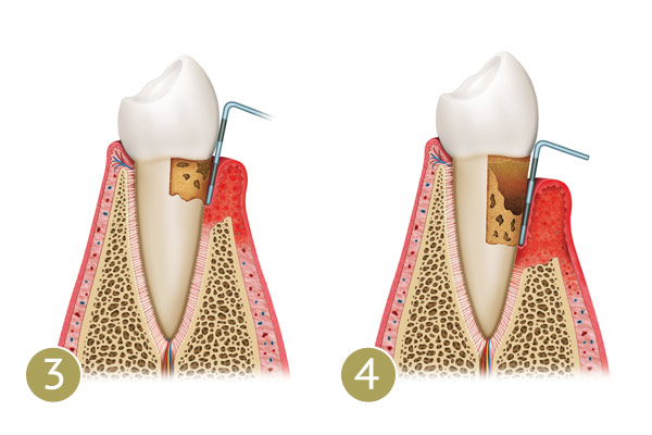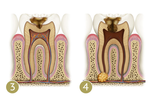 Дальнейшее разрушение зуба кариесом (3) приводит к увеличению кариозной полости и появлению чувствительности к горячему и холодному (термические раздражители), вплоть до возникновения острой боли, которая быстро проходит. Если острая боль сохраняется в течение 5–10 минут после устранения раздражителя, то такие симптомы уже говорят о развитии острого пульпита. Пульпит – это воспаление сосудисто-нервных волокон зуба, из которых и состоит пульпа — ткань, заполняющая полость зуба. Через полость зуба нелеченый воспалительный процесс может перейти на периодонт (4), то есть на ткани зуба, которые удерживают его в костной ткани и располагаются между корнем зуба и костной тканью челюсти и обеспечивают естественную (физиологическую) подвижность зубов в пределах этого пространства, что позволяет нам безболезненно жевать твердую пищу. Когда же периодонт воспаляется, накусывание на больной зуб становится особенно болезненным.