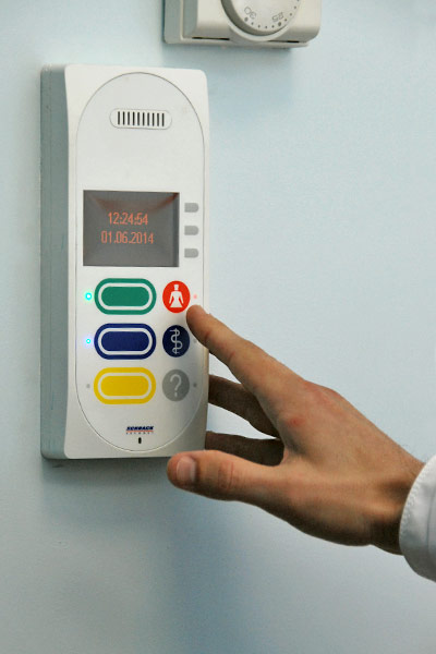 В отделении ортопедии почетным гостям продемонстрировали палаты. Для детей, которые находятся после операции, подростков либо их родителей имеется система экстренного вызова, который дублируется также на стену. Вызов медсестры — звуковой сигнал идет на пост, где видно номер палаты, из которой поступил вызов. Также каждой медсестре выдается дежурный брелок, с которым она ходит весь день, и, если она отсутствует на посту по каким-то причинам, она все равно будет знать, что идет вызов. Приходя в палату, если требуется сторонняя помощь, она может вызвать вторую медсестру или врача. Если идет повторный вызов, сигнал становится громким, слышным на все отделение, то есть уже весь персонал в курсе, что произошло что-то неотложное. Все палаты оборудованы консолью с выходом кислорода, в случае экстренной ситуации можно преобразовать палату в палату интенсивной терапии. Во всех компьютерах отделения присутствует система визуализации КТ, МРТ и рентгенографии, что позволяет планировать операцию непосредственно на компьютере.