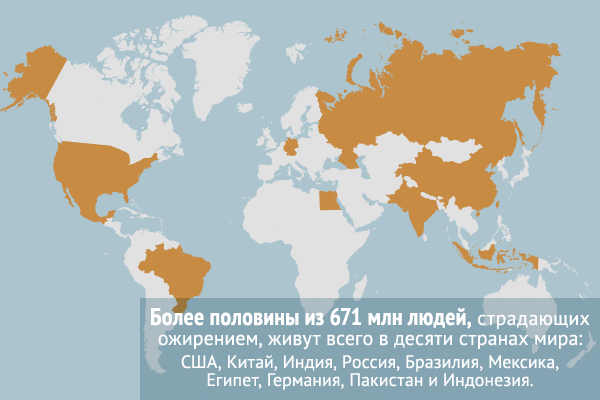 Уровень ожирения сильно различается в разных странах. Более половины из 671 млн людей, страдающих ожирением, живут всего в 10 странах мира: США, Китае, Индии, России, Бразилии, Мексике, Египте, Германии, Пакистане и Индонезии. В развитых странах темпы роста ожирения среди взрослых в последние 8 лет начали замедляться.