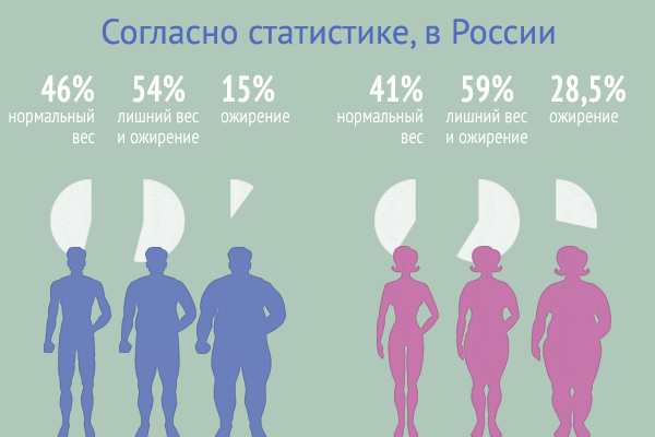 В России 54% мужчин старше 20 страдают от лишнего веса и ожирения, и ожирение (индекс массы тела >30) у 15% взрослых мужчин. Среди российских женщин цифры чуть хуже, ожирение у 28,5% женщин, а лишний вес и ожирение почти у 59% женщин.