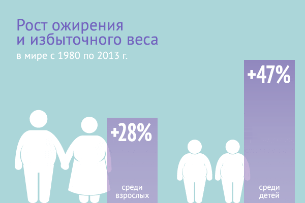 Во всем мире наблюдается рост ожирения и избыточного веса как среди взрослых на 28%, так и детей на 47% в период с 1980 по 2013 г.
