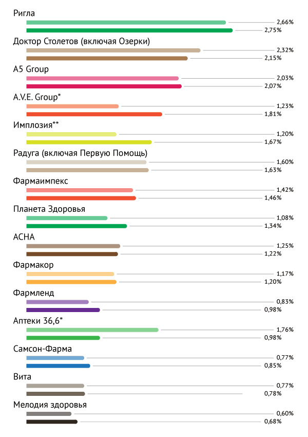 Наиболее яркие события сегодня — это процессы консолидации рынка, которые выразились как в череде крупных и средних сделок, так и в отношении создания разнообразных альянсов, роль которых на рынке с каждым днем возрастает. За прошедший год доля ТОР-15 крупнейших аптечных сетей выросла на 0,7%, достигнув рубежа в 21,3%.