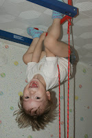 Мой сынок. Он на шведской стенке.Научился ползать,крутиться,вертеться и выполнять всякие пируэты с 1.5 лет. На фотографии ему 3 года. В таком висячем положении может продержаться минут 5,после этого повертеться на кольцах,поползать по лестнице канатной и простой.